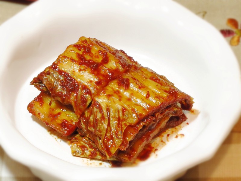 10:把白菜放入辣椒酱中,把辣椒酱抹到白菜叶中。