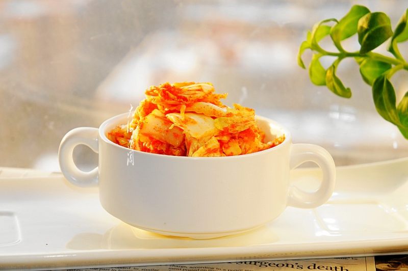 1:白菜从根部十字切开分成四份,再把每一份从根部中间向叶子方向切开,不要切断把切好的白菜放在清水中浸泡,冲洗沥干水份放入大盆中(有泡菜缸最好)均匀的撒上盐,确保每一片叶子都涂抹到盖上盖子放一天,把水倒掉再撒少许盐放两天(有石头压会快点)