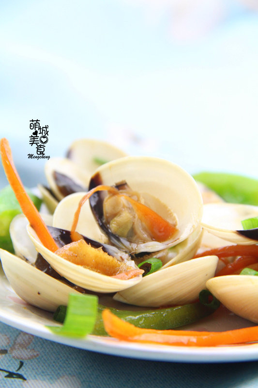 白贝1.5斤;黑木耳适量;红萝卜半根;青椒半个;葱花适量;