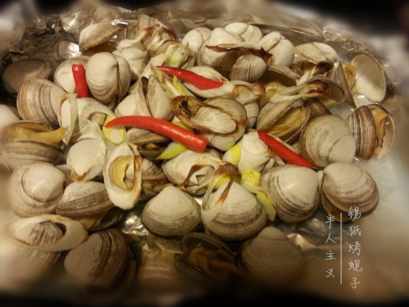 1:烤箱垫锡纸,洗净的蚬子倒上去,葱姜小米辣铺在上面。