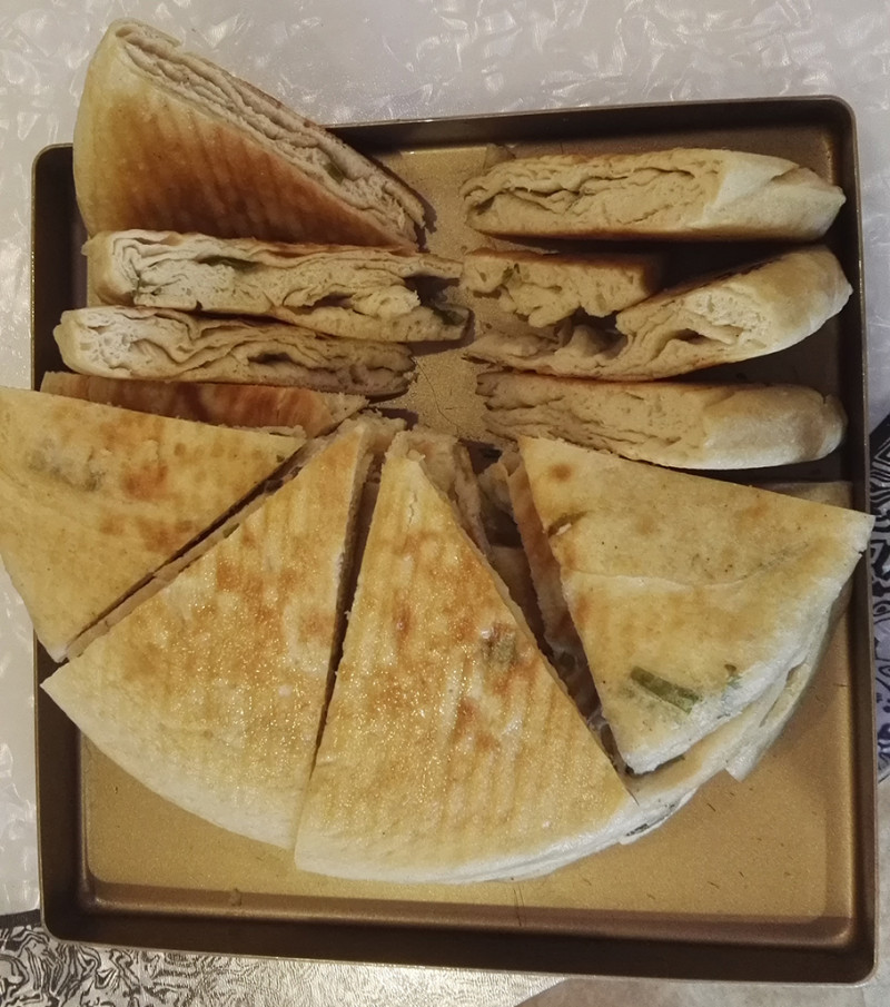 13:煎好的葱油饼,外脆内软,内馅儿葱香浓郁,混合着肉香和藤椒油等的复合香气,超级好吃~