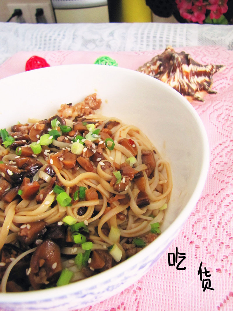 干香菇十五个;面条200克;猪肉2两;芝麻少许;
