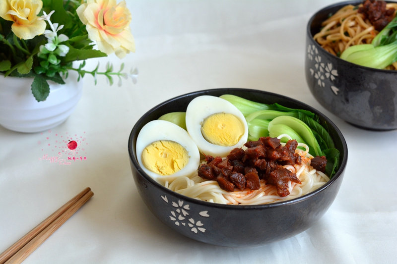 6:面条捞出,摆上青菜、鸡蛋,再浇上香菇酱