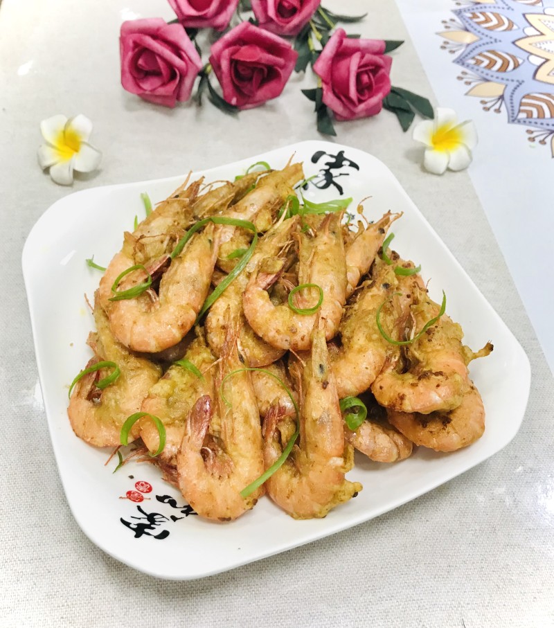 4:放入虾和食盐,小火慢慢煎至外壳变脆
