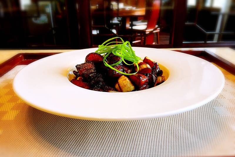 茭白红烧鸭,一道浸润江南水乡风味的家常至味。取嫩鸭斩块,与当季茭白同烧,最见火候功夫。鸭肉需先煸出金黄脂香,再以黄酒、酱油慢火细焖,待汤汁收浓,茭白吸饱了醇厚酱汁,脆嫩中透着鸭肉的鲜甜。出锅时撒一把青蒜,咸鲜软糯里蓦地跳出一丝清辛,正是寻常灶头里最踏实的丰足滋味。
