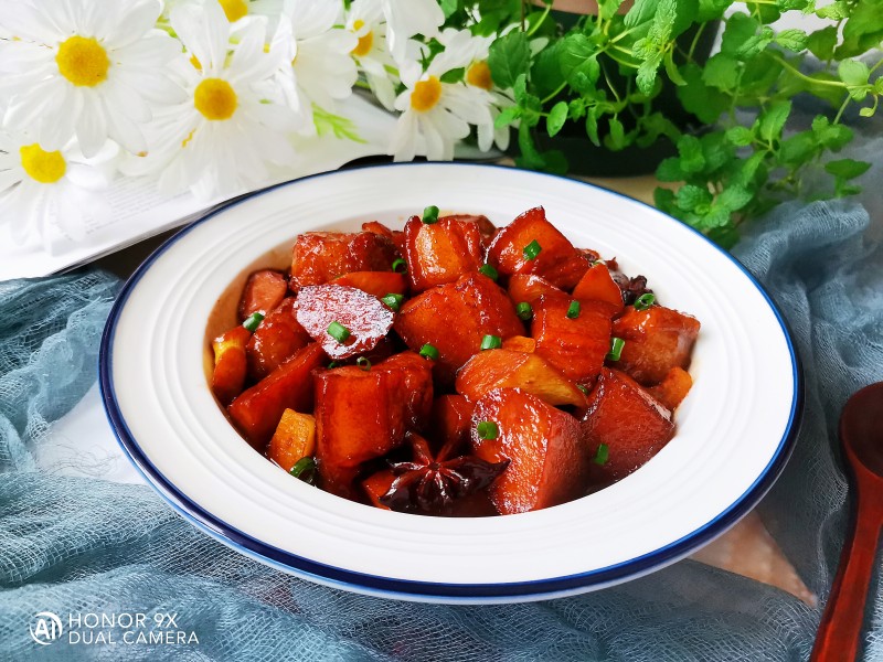 这次主要是锅具给力,所以用时很短,不用加水,不用油就可以做出好吃的红烧肉了。如果用炒锅,还是这个方法,只是要加水并炖1个半小时左右。