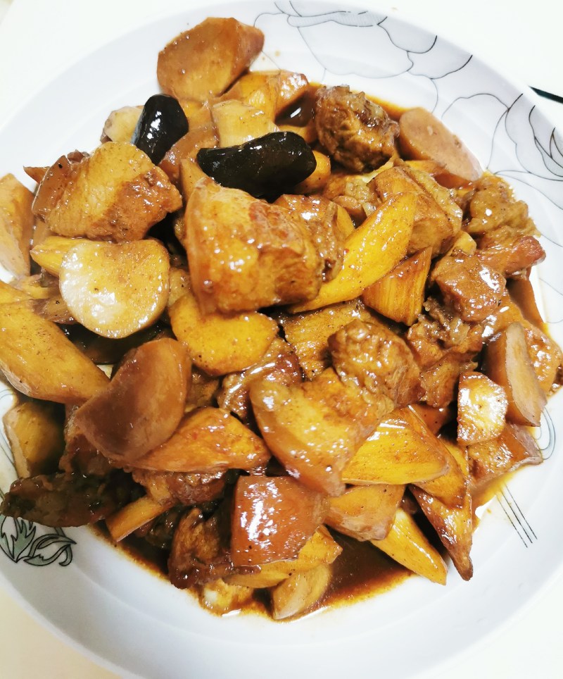 6:加入开水没过食材,放八角,香叶,花椒加盖焖煮至只有三分之一汤汁,开锅加入鸡精(根据个人口味可适当加点盐)翻炒至汤汁收干。