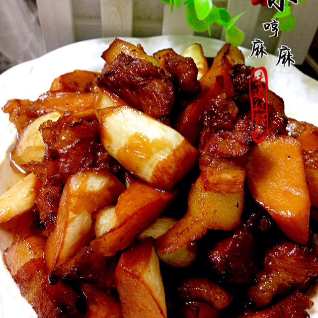 6:放电饭煲上再蒸一下,这样的茭白红烧肉是最美味的。