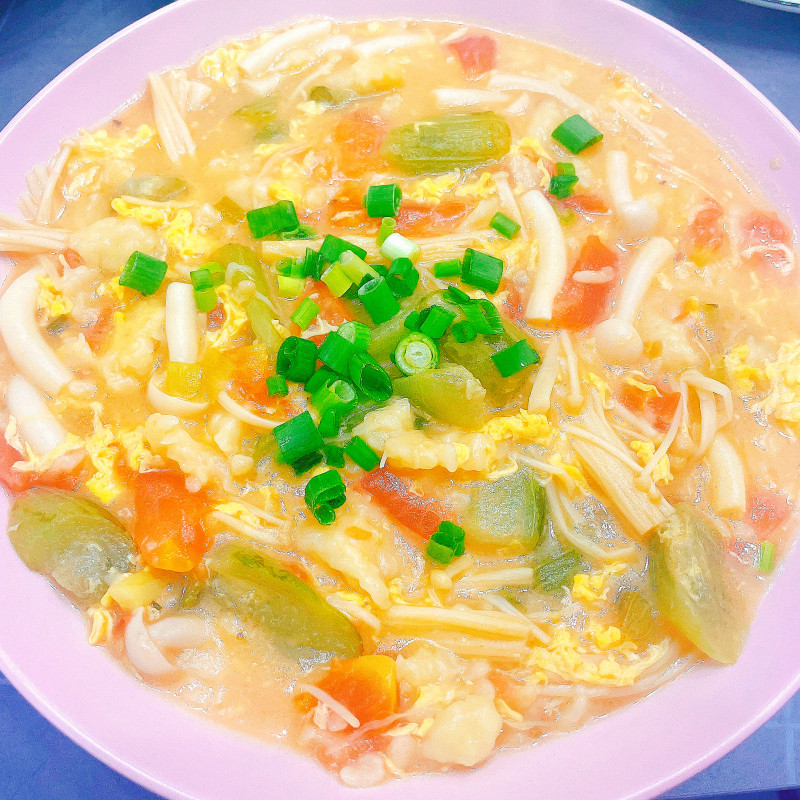 面粉大半碗;番茄2个;鸡蛋2个;丝瓜1根;白玉菇1把;金针菇1把;