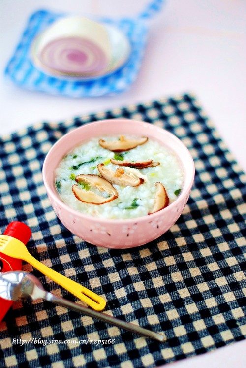 5:小火煮到大米很稠放入切碎的菠菜末和香菇末,放少许盐关火焖一会儿。