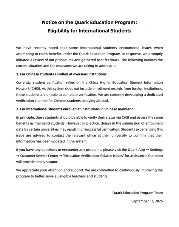 如仍有疑问或遇到问题,可在「夸克APP-设置-客服中心-教育认证相关问题」入口问询,夸克将及时提供支持。