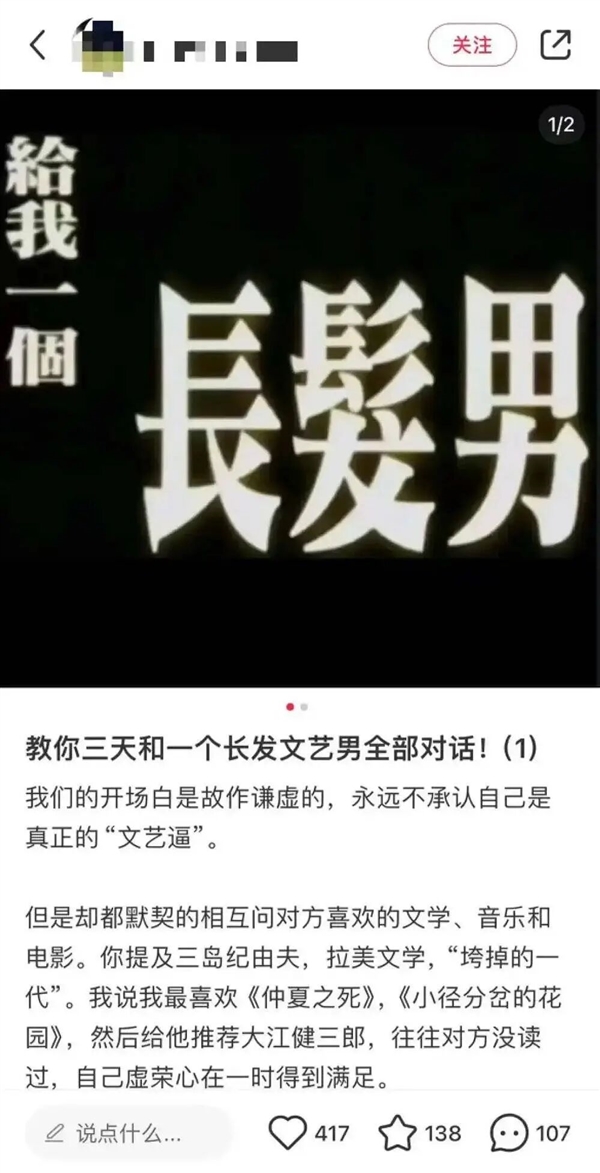 那些迷恋长发文艺男的女性,不过是执迷于大环境下塑造的文化消费符号,给长发男戴上一层朦胧梦幻的滤镜,把长发男视为自己绝望异性恋生涯的救命稻草。
