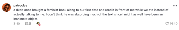 “有个哥们在和我第一次约会的时候带了一本女权书籍,在我们吃饭的时候,他不和我聊天,反而全程大声朗读女权书籍。我觉得他根本没理解书里的内容,我对他而言只是一个证明自己的客体罢了。”