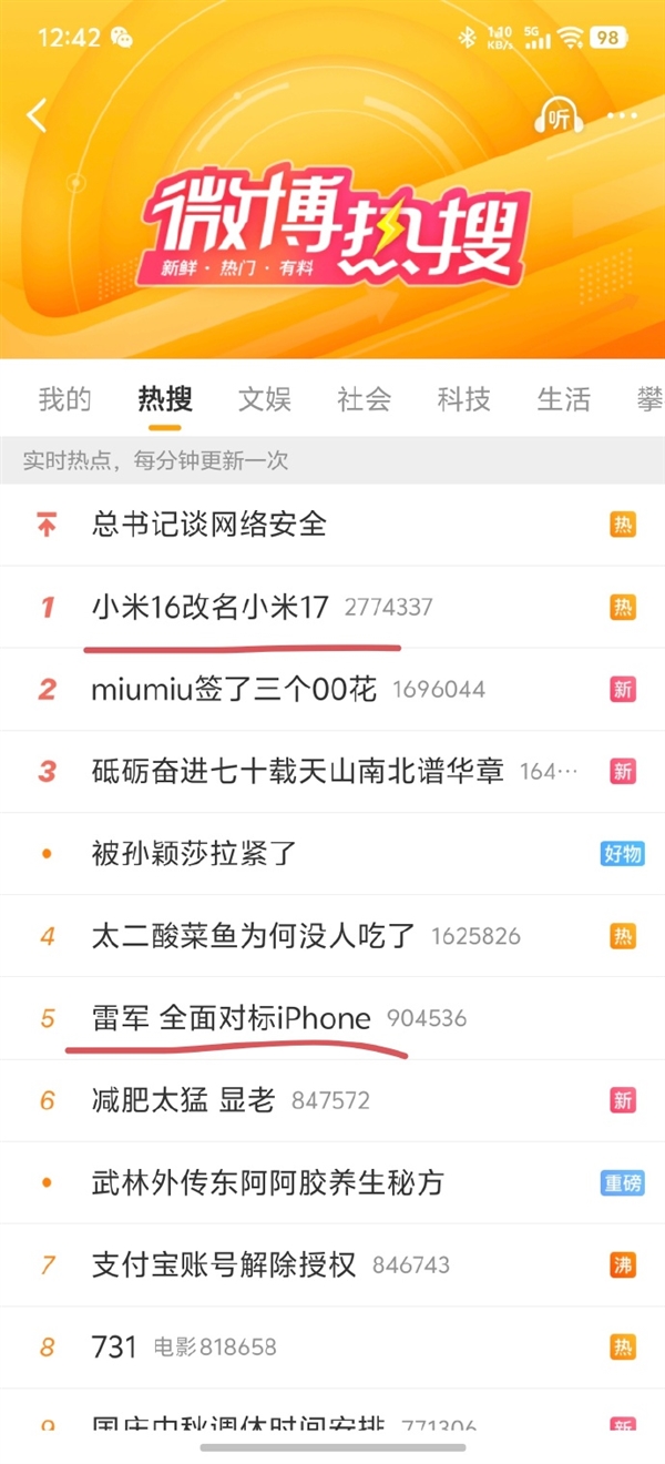 从微博实时热搜榜看,“小米16改名小米17”、“雷军 全面对标iPhone”等话题都被挤进了热搜榜前十名,关注度非常的高。