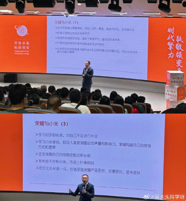赵明还讲到学习小米营销,但没人能复刻雷总的声量和影响力,荣耀构建自己的营销方式和逻辑,坚决发展自己的战略控制点和长板,发布会不对标小米,市场上针锋相对,定价比小米高一点,价值呈现荣耀产品更好,质量更好,服务更好。