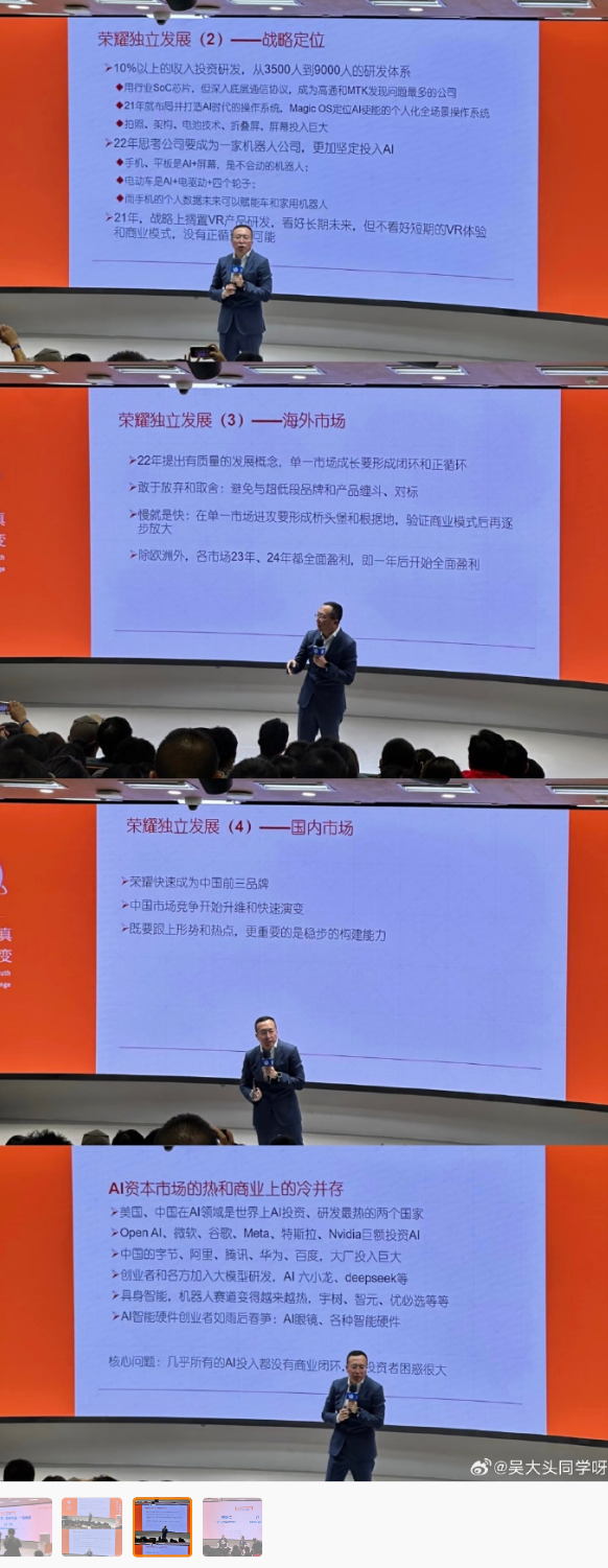 据博主“吴大头同学呀” 分享,赵明昨晚在复旦大学演讲时提到了荣耀和小米的关系、荣耀独立发展的过程,以及对于目前 AI 时代的种种看法等。