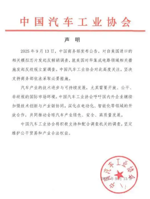 9月15日消息,今日,中国汽车工业协会在其官网发表声明表示,支持商务部对美相关产品及措施发起调查。