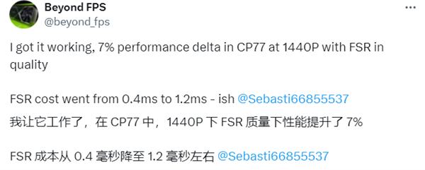实测显示,一位RX 7900 XTX用户在《赛博朋克2077》1440p最高画质+光追环境下,以FSR 4替换原生FSR 3.1,平均帧率仅下降6-7 FPS,草地闪烁与边缘锯齿却几乎消失,整体清晰度大幅提升。