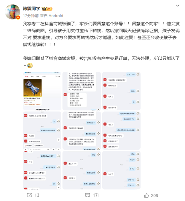 9月16日消息,今日,知名汽车大V微博发文称,自己家小儿子在抖音商城被骗了,提醒各位家长们留意这个账号以及商家。
