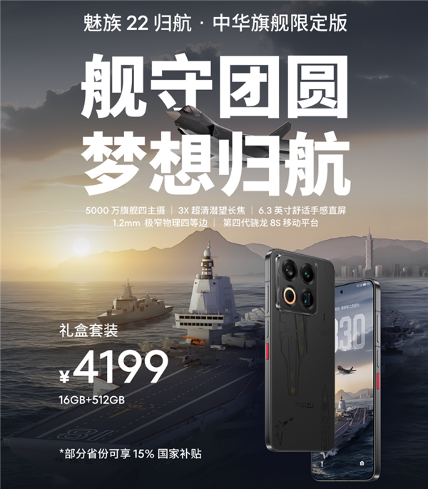 哦对了,发布会的最后还有一个 One More Thing ,是魅族 22 的 “ 旗舰限定版 ” ,包含了合肥舰、 055 驱逐舰和歼 35 的元素,有定制的系统 UI 、机身背板和周边礼盒,16GB + 512GB 定价 4199 ,算是对之前魅族 17 航母定制版的致敬。