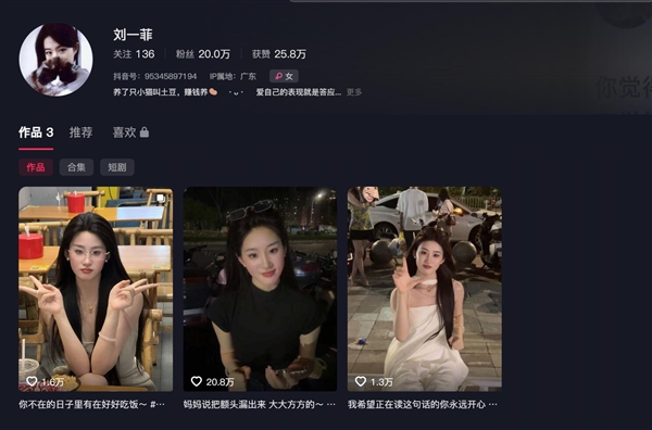 据了解,这名女孩的抖音账号叫“刘一菲”,她仅仅发布了三条视频便涨粉20万,获赞25.8万。