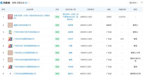 天眼查显示,谢萌关联66家企业,其中有28家企业担任法定代表人,包括广州正佳白云文旅集团有限公司、广州市正佳科技服务集团有限公司、广州荣汉科技开发有限公司、广州市恒基信息科技有限公司等等。