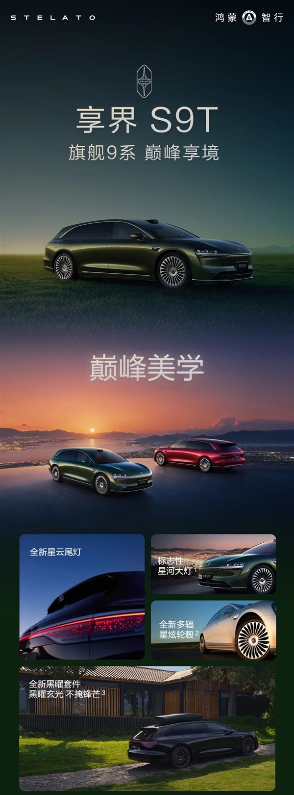 享界S9T采用寰宇美学设计语言,提供流光银、仙踪绿等6种寰宇色系外观配色,黑曜套件包括黑色车标、红色卡钳和黑色窗框