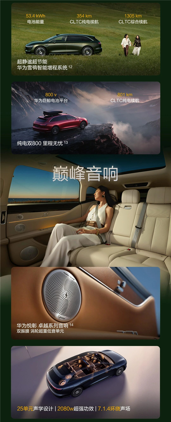 搭载华为悦彰音响卓越系列,带有23个扬声器和2个主驾头枕扬声器,系统包括 7 个环绕声道、1 个重低音声道以及 4 个天空声道,功放输出达到2080瓦,且首发全新HUAWEI SOUND SUPERIOR大师音网设计。