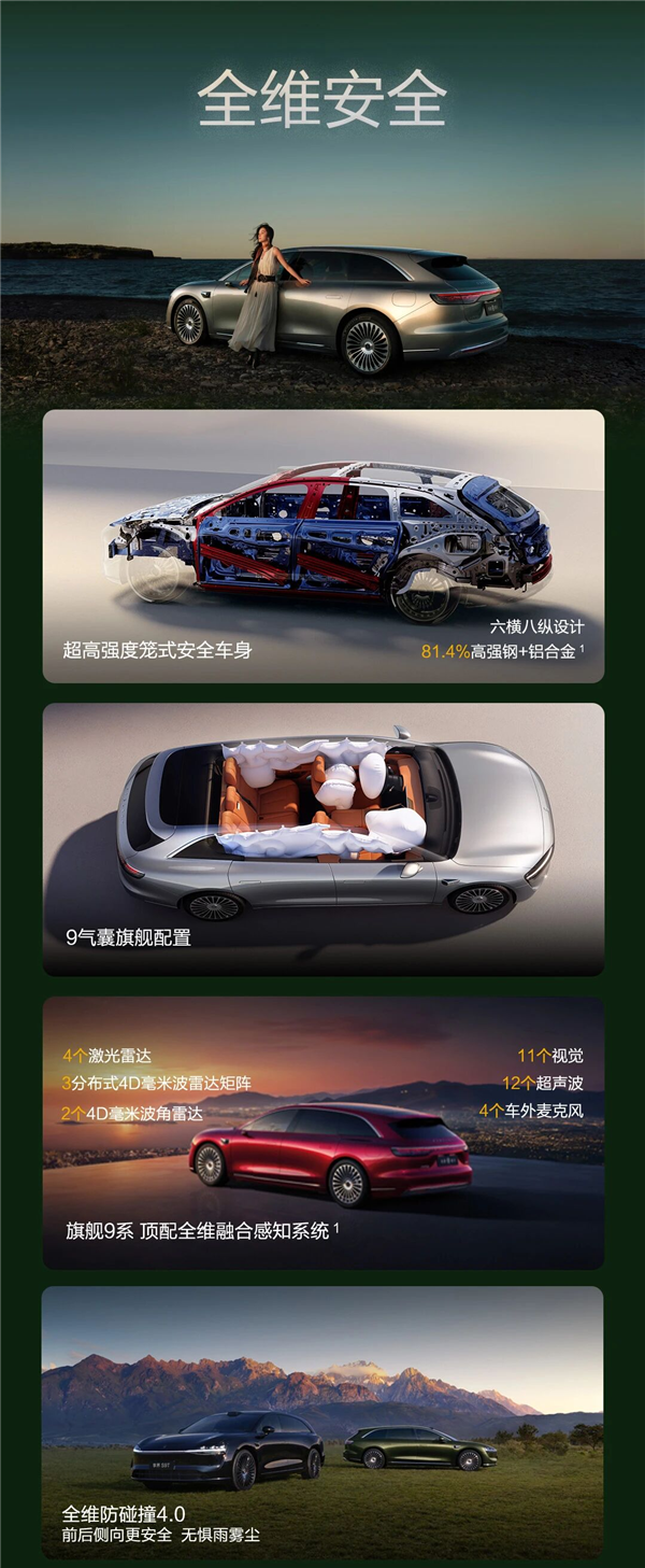 纯电版提供单电机后驱(227kW)和双电机四驱(385kW)两种版本,标配宁德时代100kWh三元锂电池组,CLTC续航最高可达801km,且支持超快充补能。