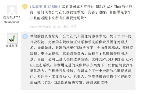 9月17日消息,据媒体报道,豪威集团近日在互动平台宣布,公司已正式进入英伟达供应链,将为NVIDIA DRIVE AGX Thor生态系统提供先进的成像解决方案,助力下一代智能驾驶汽车实现更高水平的性能与安全。