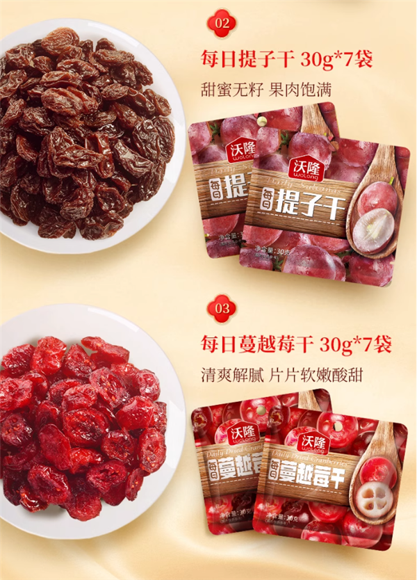 三款美味搭配,内含每日坚果清新款25gx14袋、每日提子干30gx7袋、每日蔓越莓干30g x 7袋。