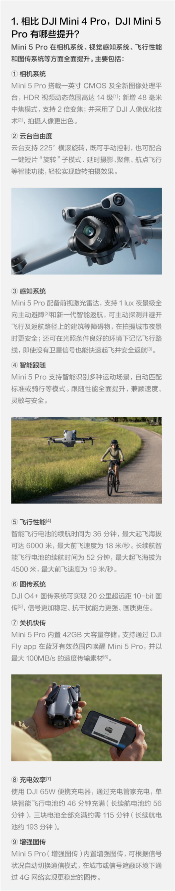 相比上一代Mini 4 Pro,Mini 5 Pro在相机系统、视觉感知系统、飞行性能和图传系统等方面全面提升。