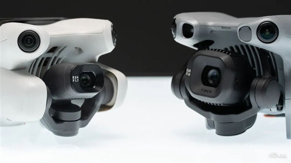 要是再细节一点,你还会发现 Mini 5 Pro 的云台相比之前,不仅变大了一圈,它的结构也变得更为复杂,这是因为大疆直接把云台传感器尺寸从之前的 1/1.3 英寸,一下子跃升到了 1 英寸大底。