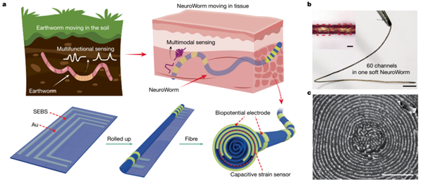 据了解,研究团队受蚯蚓在土壤中灵活运动和分段感知能力的启发,通过精巧的电极结构设计和卷曲技术,将制备在超薄柔性聚合物上的二维电极阵列卷曲成一根直径仅约200微米的纤维。