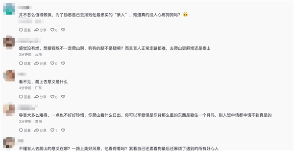 有网友表示,普通人爬一段路都累的不行,更别说还得让一只导盲犬带着爬,并且是下雨天,台阶很陡,一不注意还有可能滑倒,下山的时候看到这只导盲犬已经很累了,导盲犬不应该浪费它的工作性能。狗狗爬台阶对关节的损害非常大,它要不停的给主人一些信号,还要不停的往上爬,不敢想象它会有多累。