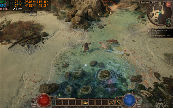 帧率方面,虽然游戏制作方给到的推荐配置不低,但从实际运行情况来看,OMEN暗影精灵11完全可以轻松应对。游戏的帧率集中在210-240帧之间,平均帧率高达226帧,流畅度非常优秀。整个过程中有三个场景切换,由海边出发,经过洞穴,到达平原,游戏的帧率并没有因为场景的变化而出现明显波动,体验自始至终保持一致。