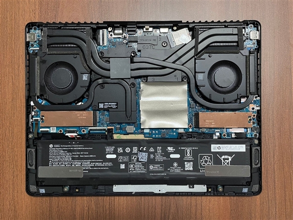 核心温度的控制就更夸张了。RTX 5070 Laptop的核心温度最高点甚至没有越过78℃,平均只有77℃,非常低。i7-14650HX的核心温度也不高,最高温度只有84℃,这在此前测试的几款3A游戏中很难见到,平均温度也只有77℃。事实上游戏过程中的散热压力并不小,毕竟显卡几乎全程满血。核心温度偏低的主要原因在于,OMEN暗影精灵11的散热设计有着越级的能力,其搭载的酷凉风暴Pro散热技术足以应对负载更高的游戏场景,即使面对整机175W+的性能释放也完全足够。从拆机图(下方图片靠近左侧风扇位置为显卡)上能够看到,用更多的散热资源为显卡导热,自然对显卡的温度有着更强的控制力。运行《泰坦之旅2》过程中显卡全程在115W左右,OMEN暗影精灵应对起来也绰绰有余。