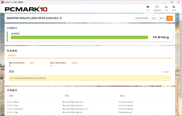 其次是Office办公场景,该场景聚焦在Office套装和Edge浏览器的使用,对学生用户以及部分文职有比较高的参考价值。实测最终成绩同样比较给力,达到了8小时40分钟,足以应对学生用户在教室、图书馆的使用需求了。不需要携带适配器,会方便很多。