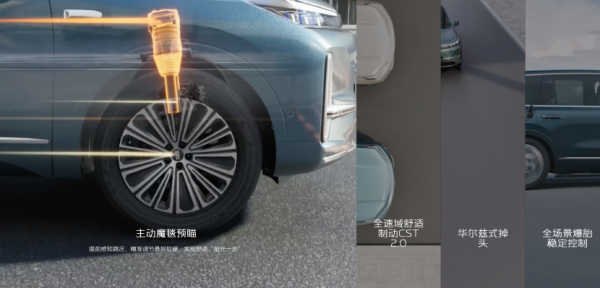 底盘部分,银河M9由路特斯工程调校,采用前双叉臂+后五连杆悬架组合,可选装双腔闭式空气悬架和CCD连续可变阻尼减震器,顶配采用分布式三电机动力形式,不仅提供4.5s零百加速性能,还可实现华尔兹式掉头、3.45米最小转弯半径、漂移泊车等极致操控体验;