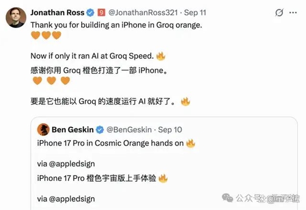 就在最近,CEO乔纳森·罗斯还调侃了一下iPhone的新配色是“Groq橙”。