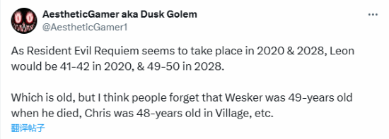 9月17日,AestheticGamer在推特里再次发文,称《生化危机9:安魂曲》的背景似乎设定在2020年和2028年,里昂在2020年应该是41岁至42岁,在2028年应该是49岁至50岁。“虽然年纪偏大,但我觉得人们可能忘了:威斯克去世时是49岁,克里斯在《生化危机8:村庄》里也是48岁等等。”