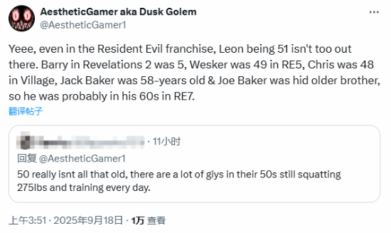 AestheticGamer的这番言论引来一些玩家围观,有玩家认为50岁实际上并不算老,因为这一年龄的人每天还在坚持锻炼,AestheticGamer回应道:“确实,即使在《生化危机》系列中,里昂51岁的设定也并不违和。《生化危机:启示录2》中的巴瑞是55岁,威斯克在《生化危机5》中是49岁,《生化危机8:村庄》里的克里斯是48岁,杰克·贝克是58岁,而乔·贝克作为他的哥哥,在《生化危机7》中可能已经60多岁了。”