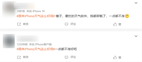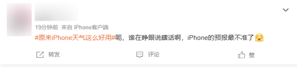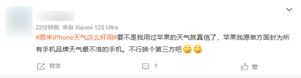 有网友表示:“只有用过苹果的才知道,是多么不准吧,都下了别的App来看天气”“呃,谁在睁眼说瞎话啊,iPhone的预报最不准了。”“要不是我用过苹果的天气就真信了,苹果我愿单方面封为所有手机品牌天气最不准的手机。不行换个第三方吧。”