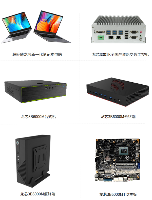 目前,已经有数十家企业基于龙芯3B6000M推出了板卡、工业控制器、工控一体机、工业平板、笔记本、云终端和云笔记本等产品,可广泛应用于复杂工业场景、AI推理任务,以及能源、交通、制造等行业领域。