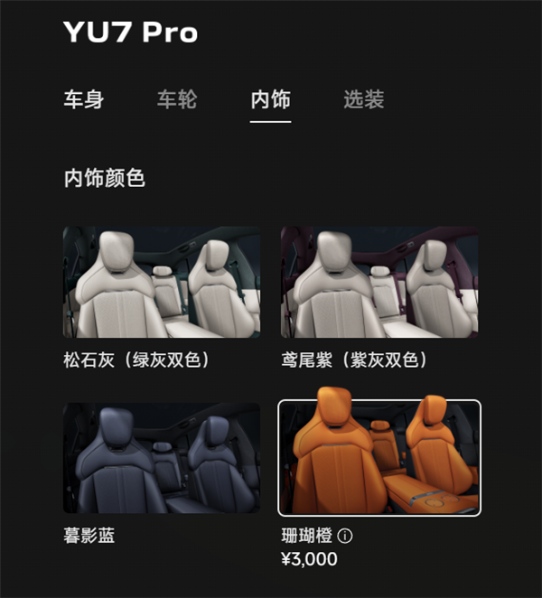据了解,小米YU7有4个内饰可选,包括“松石灰”““鸢尾紫””“暮影蓝”“珊瑚橙”。