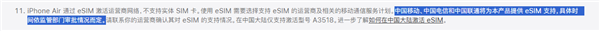 在批注中,苹果称:“在中国大陆,中国移动、中国电信和中国联通将为本产品提供eSIM支持,具体时间依监管部门审批情况而定。”