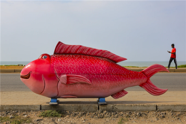 2025年7月25日,非洲加纳阿克拉的马路边摆放着一条巨型粉色鱼,非常扎眼。