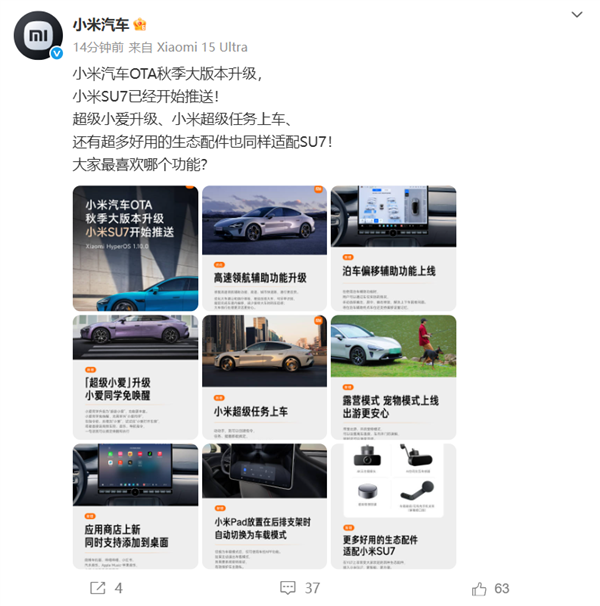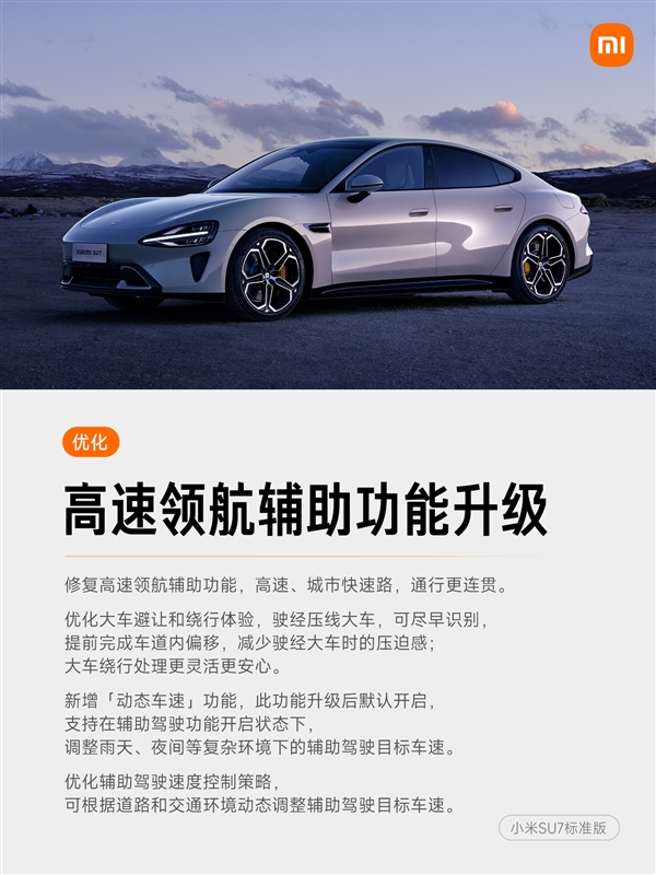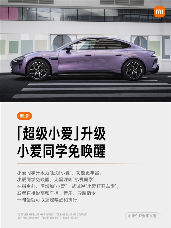 9月19日消息,小米汽车宣布,小米汽车OTA秋季大版本升级已开始在小米SU7车上推送。