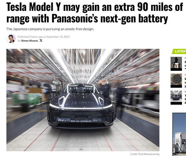 9月18日消息,海外媒体最新报道称,松下正在研发一款新型高容量电动汽车(EV)电池,有望使特斯拉Model Y的续航里程延长90英里(约145公里)。