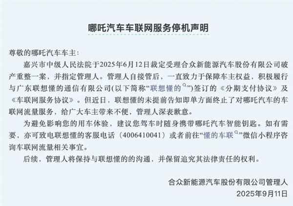 就在9月11日,哪吒的流量服务商“联想懂的”公司(真就是这个名字)给哪吒车主们发送了集体短信,称哪吒汽车拖欠其数月服务费,协商无果后直接断了哪吒车机的基础流量。